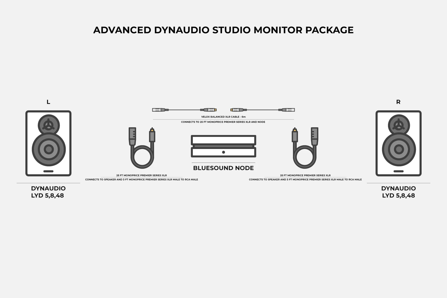If you watch the video at the bottom of this description, I detail how to set this all up. You’ll be up and running within a matter of minutes. Depending on your selection, we will send you the appropriate cables you’ll need to set this up successfully. An example of that would be, you decide you want to go with the LYD 8’s and a node – in that package, we’d send you a pair of
