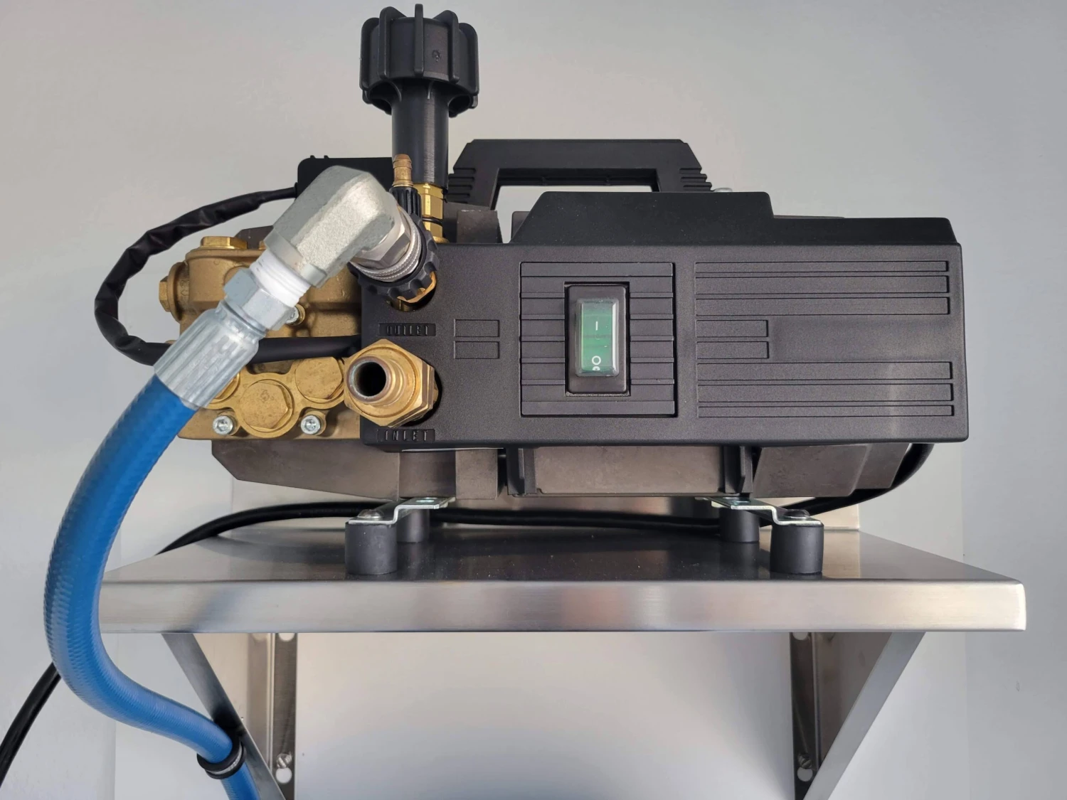 The male threads on the anti-vibration dampers should now be attached to the AR and should be facing toward the ground; this makes it easier to mount the AR to the shelf. Align the threads on the anti-vibration dampeners with the holes in the shelf and place the pressure washer on the shelf.