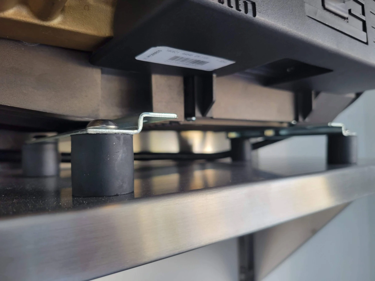Now that the holes are drilled, you can secure the machine to the shelf. Take the feet off of the AR using a 5mm Allen wrench. Put the 5mm pan head hex bolts through the holes in the feet where the rubber pads were. Thread the anti-vibration dampeners to the bolts. Next, reinstall the feet on the AR.
