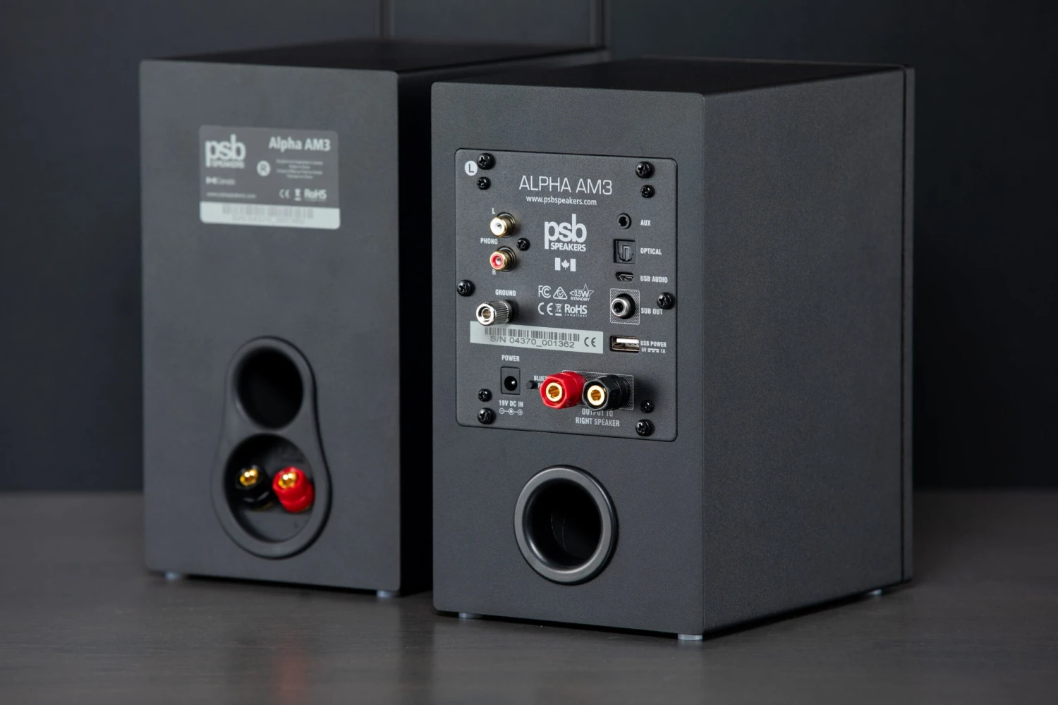 Looking at these from behind, you’ll see that one speaker is the passive speaker (where the speaker wire comes in) while the other is the active speaker (amplified speaker) with all of our inputs. I’m telling you, I don’t know what Paul Barton (chief designer of PSB) did with these things, but they sound freaking amazing.