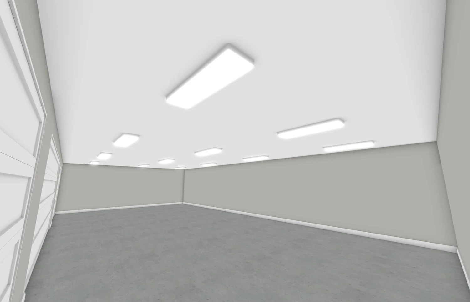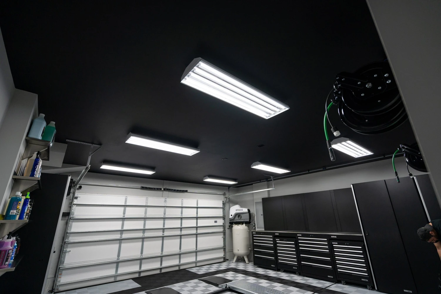 We get a lot of questions on lighting layouts and how many fixtures to purchase. For a four-car garage, you’ll be shooting for a four-wide and three-deep layout. Cover each parking space with three fixtures perpendicular to the vehicle, and you’ll be off to a good start. These lights have a super high lumen output, but they find a way to not be too harsh on your eyes. The color temperature is exactly what you want for your four-car garage.