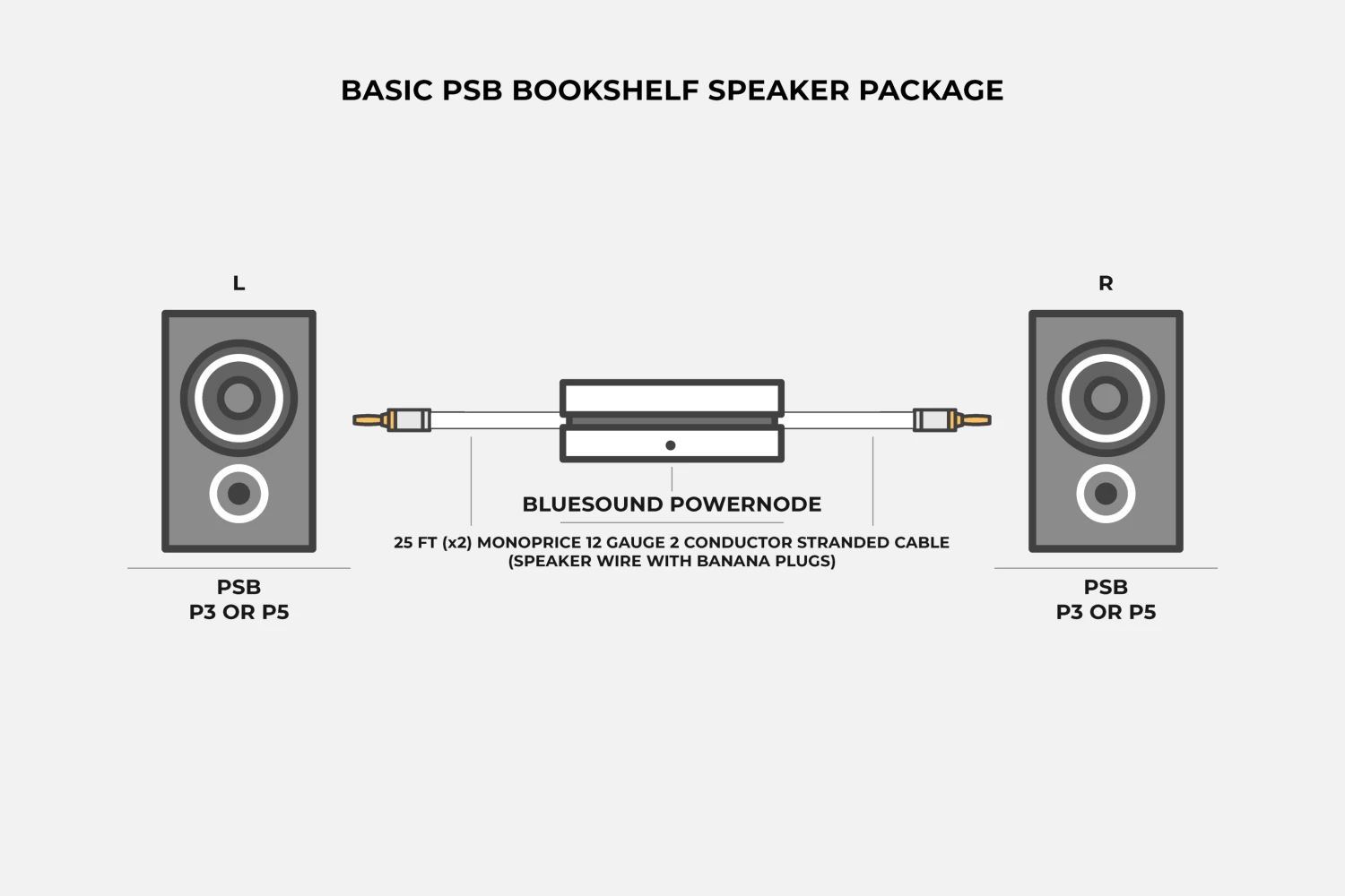 You’ll see how easy it is to set this thing up. It’s super simple to do. In this package, you’re getting your speakers (PSB P3 or P5), optional Bluesound Powernode, 50’ of