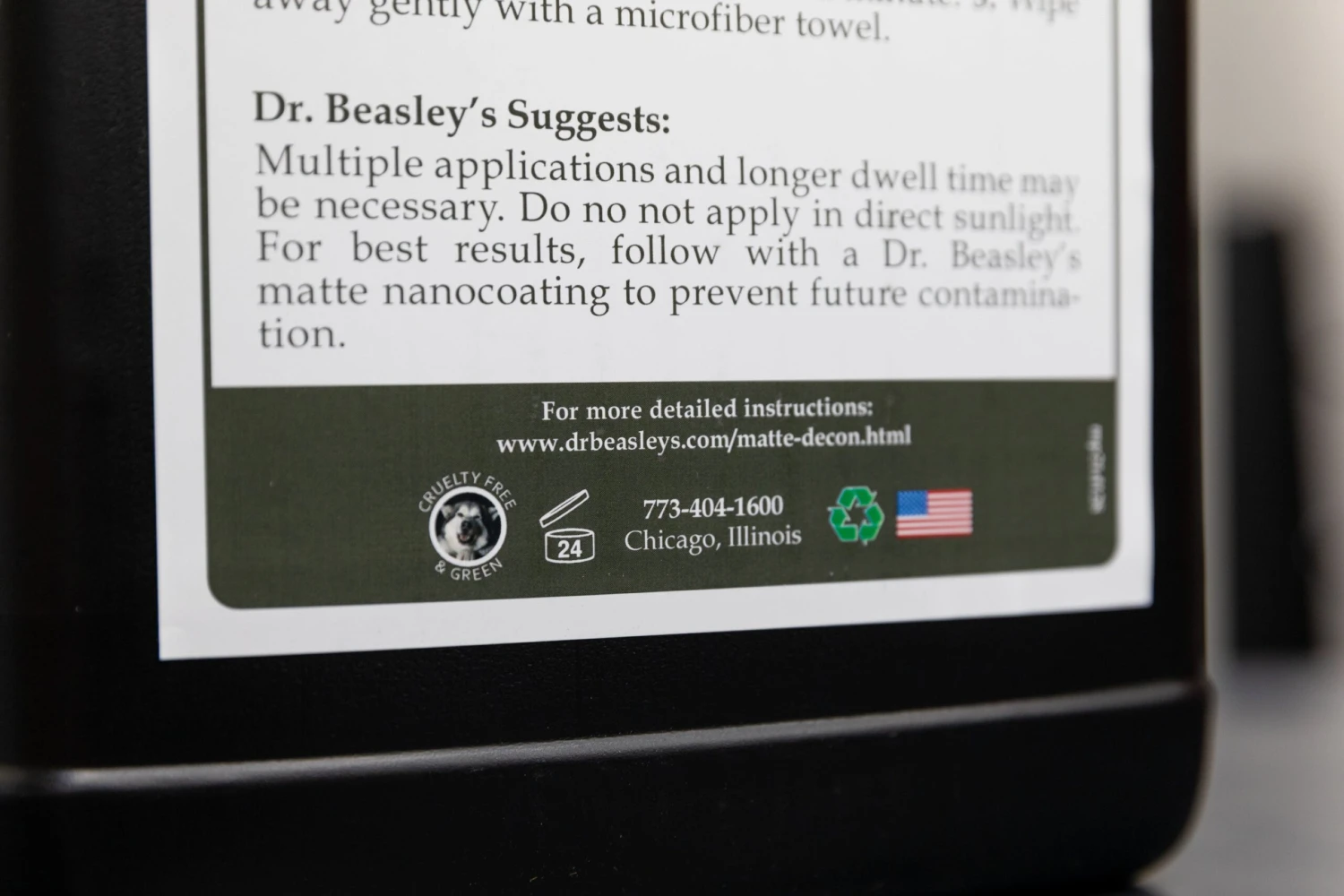 For best results, protect with Dr. Beasley’s Matte Paint Coating or Matte Paint Coating Pro after decontamination to prevent future contamination.