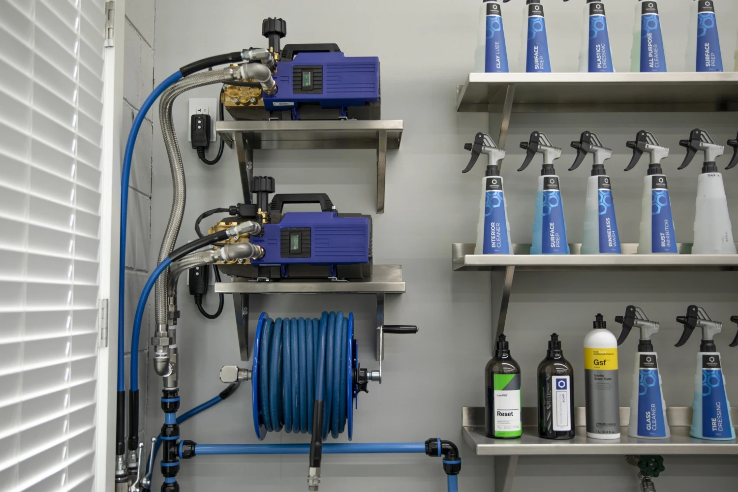 This solution comes with everything you need, from the hoses to the shelves, pressure washers, nozzles, etc. Compared to the normal Custom Install Solution, there are some differences you’ll want to be aware of: