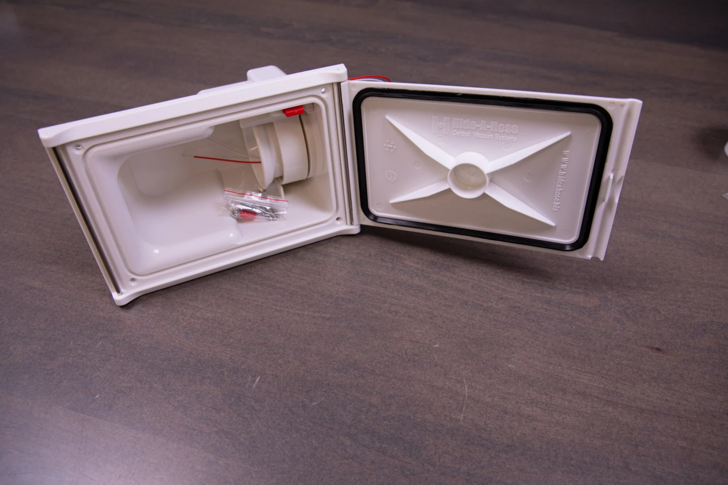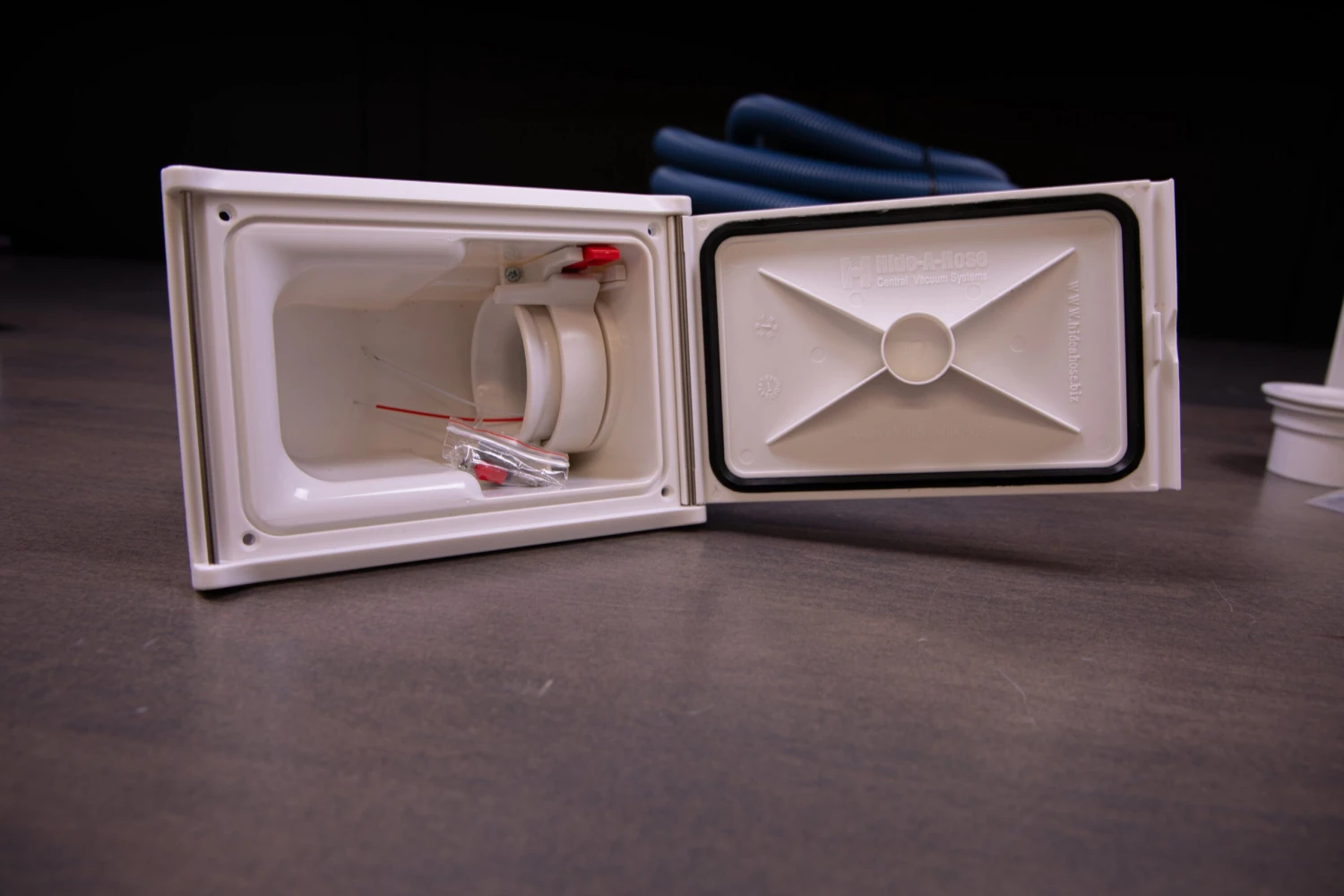 or by itself if you already have a vacuum. It does exactly as the name suggests: It hides your vacuum hose in the wall. So, instead of having an entire hose reel on the wall, all you’ll see is a small panel that you can pull the hose out of.