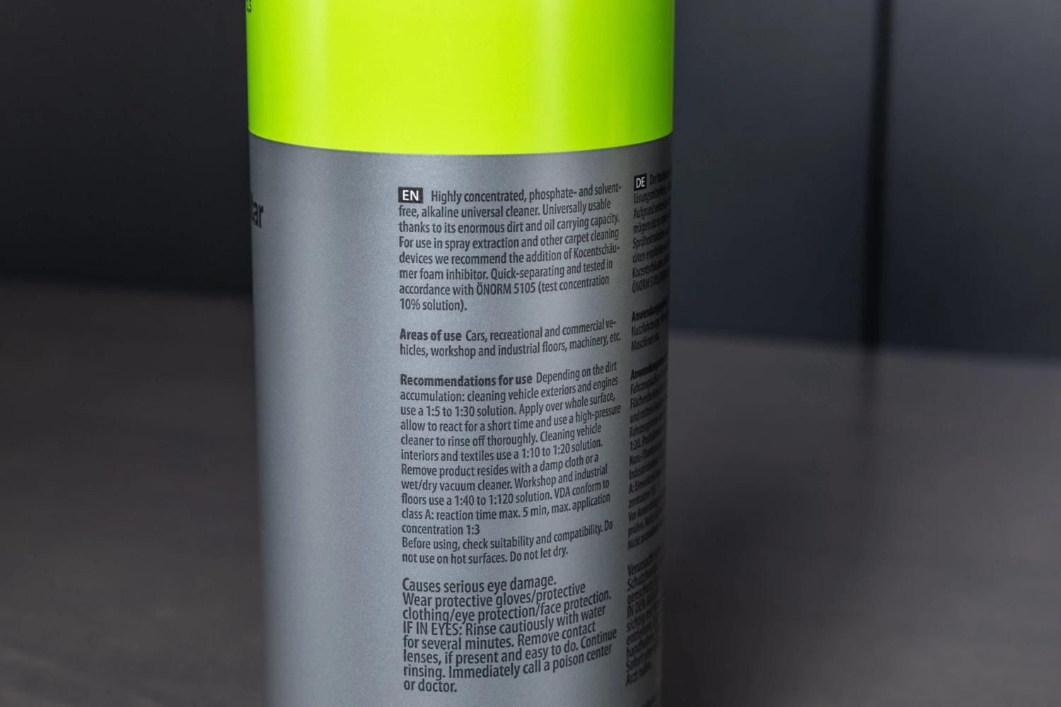Highly concentrated, phosphate- and solvent-free, alkaline universal cleaner. Universally usable for the areas of workshop floor and industrial cleaning, interior and exterior cleaning of cars and trucks and engine cleaning thanks to its enormous dirt and oil carrying capacity. Special corrosion inhibitors ensure high material compatibility with regard to sensitive components such as, electro-galvanized, anodized aluminum. For use in spray extraction and other carpet cleaning devices we recommend the addition of Kocentschäumer foam inhibitor. Optimally suited as well for biological service water treatment plants. Quick-separating and tested in accordance with ÖNORM 5105 (test concentration 10% solution). VDA conform to class A: reaction time max. 5 min, max. application concentration 1:3