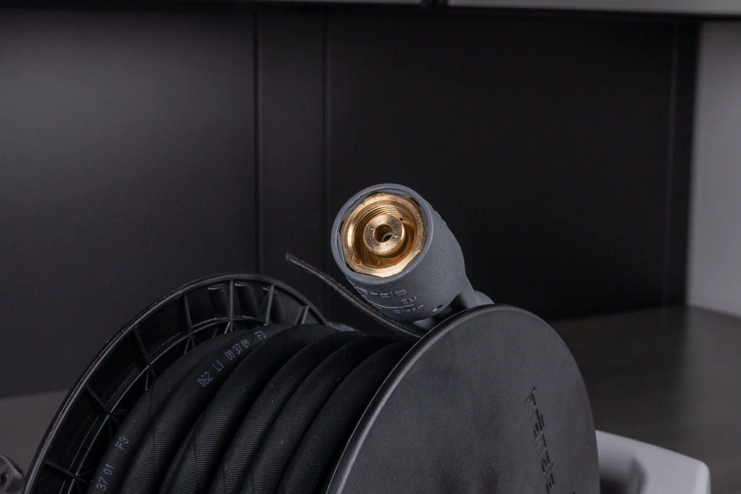 The 50 ft hose that comes with it is surprisingly nice. It’s a braided hose that comes on a hose reel. It also features a steel frame with a plastic cover that can hold your accessories. Super nice and convenient for those of you who want to move about freely.