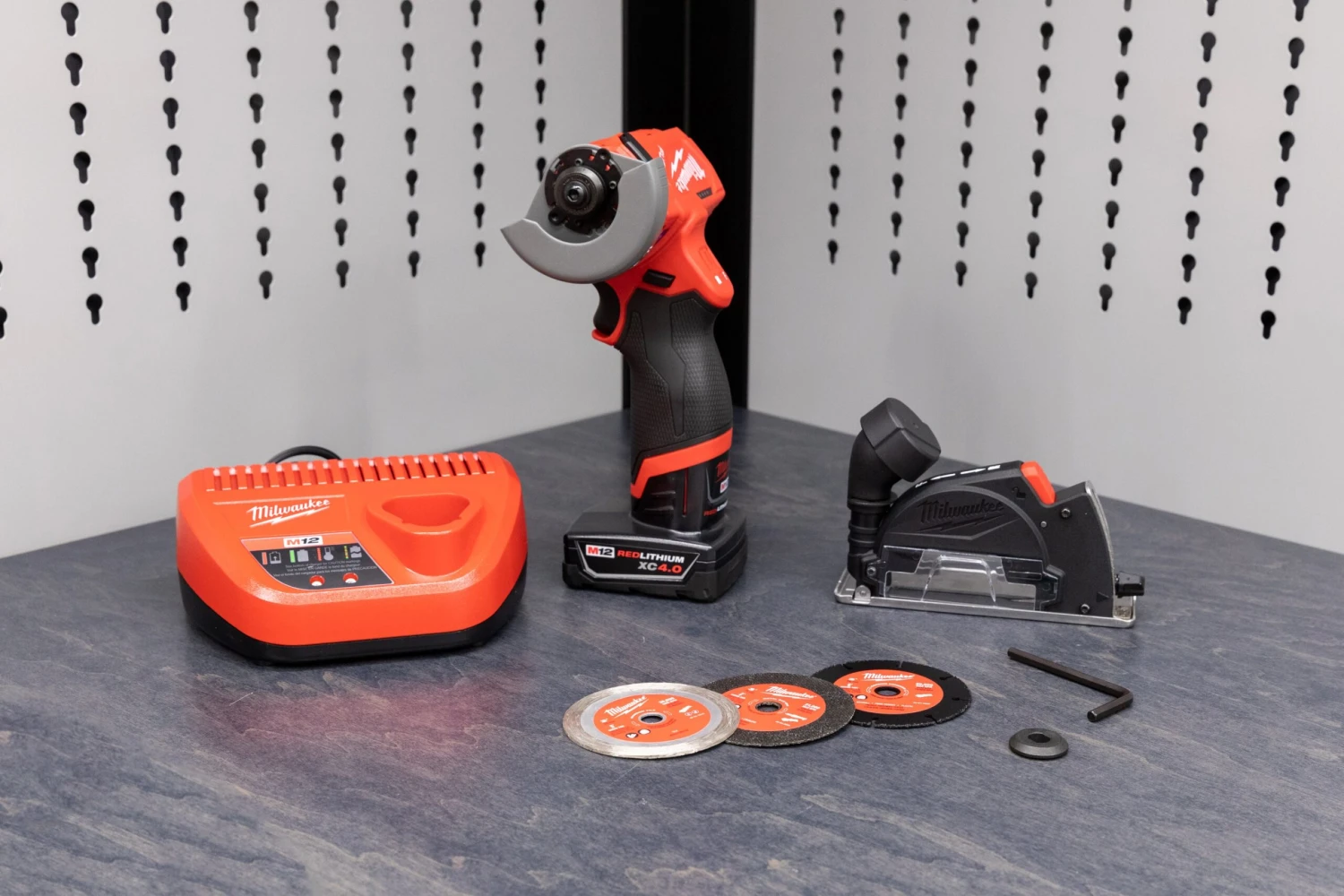 The Milwaukee M12 3″ cut off tool is pretty small and lightweight, weighing only 1.5 pounds so you can use it one handed. The Milwaukee M12 3″ spins up to 20,000 RPM with the powerful brushless motor. The Milwaukee M12 3″ compact cut off tool comes with a XC 4.0 Extended Capacity battery pack, charger, and 3 different cut off wheels (Metal, Diamond Tile, Carbide).