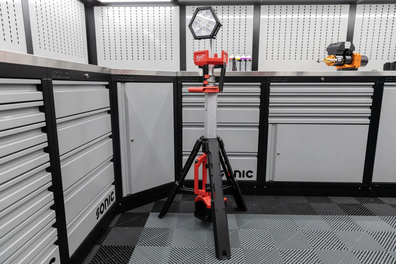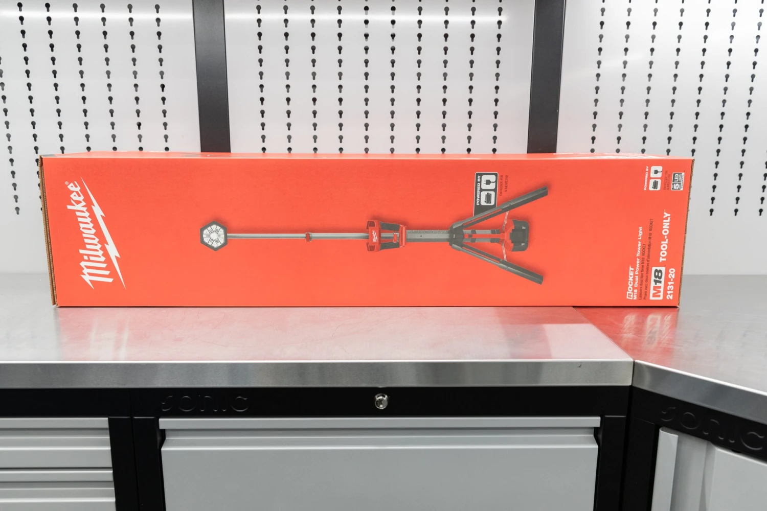 Milwaukee makes a lot of work lights, and all of them are great, but which ones do I think are the most useful? For us working in the garage, I think there are three solid choices to have in your cabinet. The M18 Rocket Light is perfect for when you need a stationary light with a good amount of output. There’s an added bonus in that it’s dual-powered so you can use it with your M18 batteries or plug it into an outlet. We sell this as Tool Only, so no batteries or chargers are included.