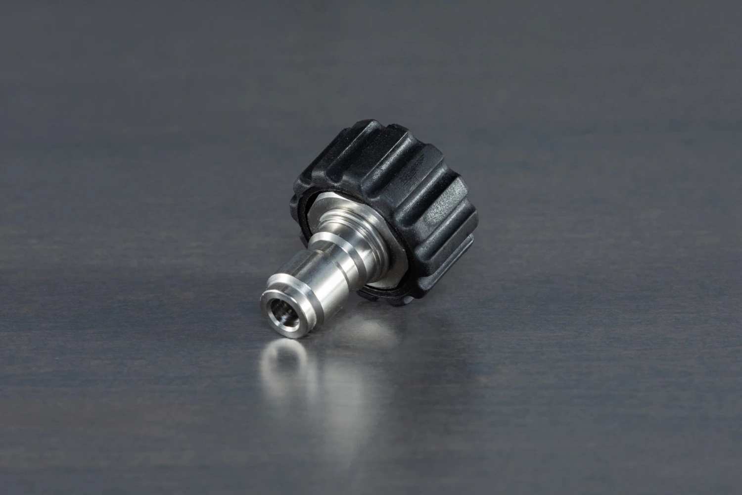 This fitting is used to convert the outlet of a pressure washer from an M22 (15mm) connection to a ⅜” QD Plug. Use this T304 Stainless Steel fitting on Active, Comet, SunJoe, and AR Blue Clean Consumer pressure washers that have M22 (15mm) Male outlets so that a hose with QD couplers on it can attach to the pump. This Swiss-made fitting is the highest quality fitting on the market.