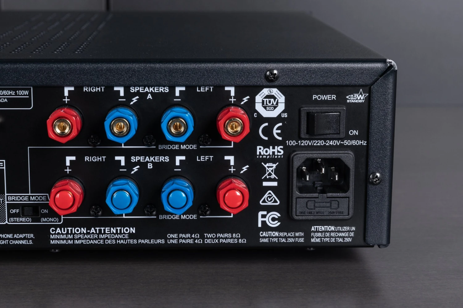 - 2 pairs of binding post speaker connectors for A and B speakers