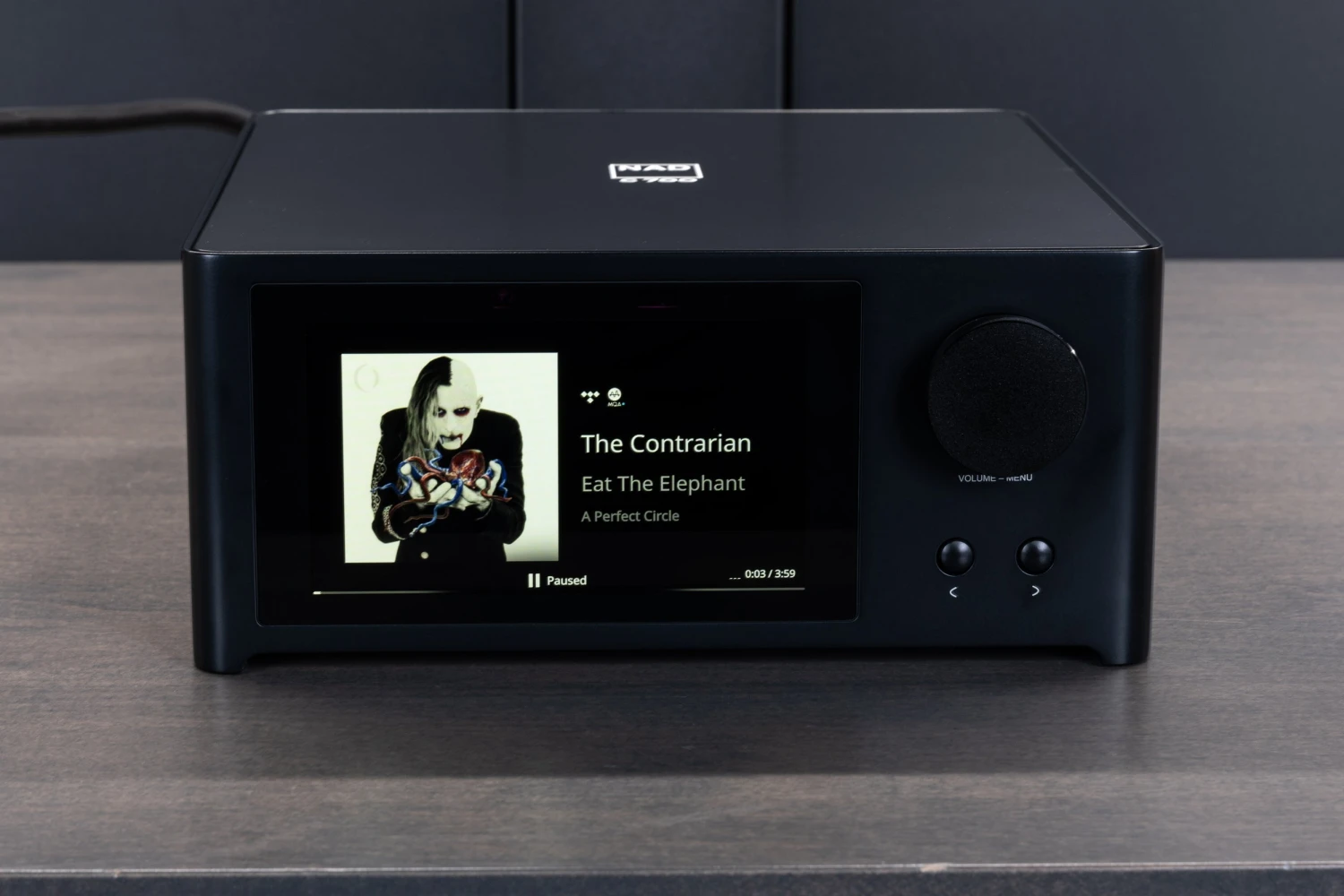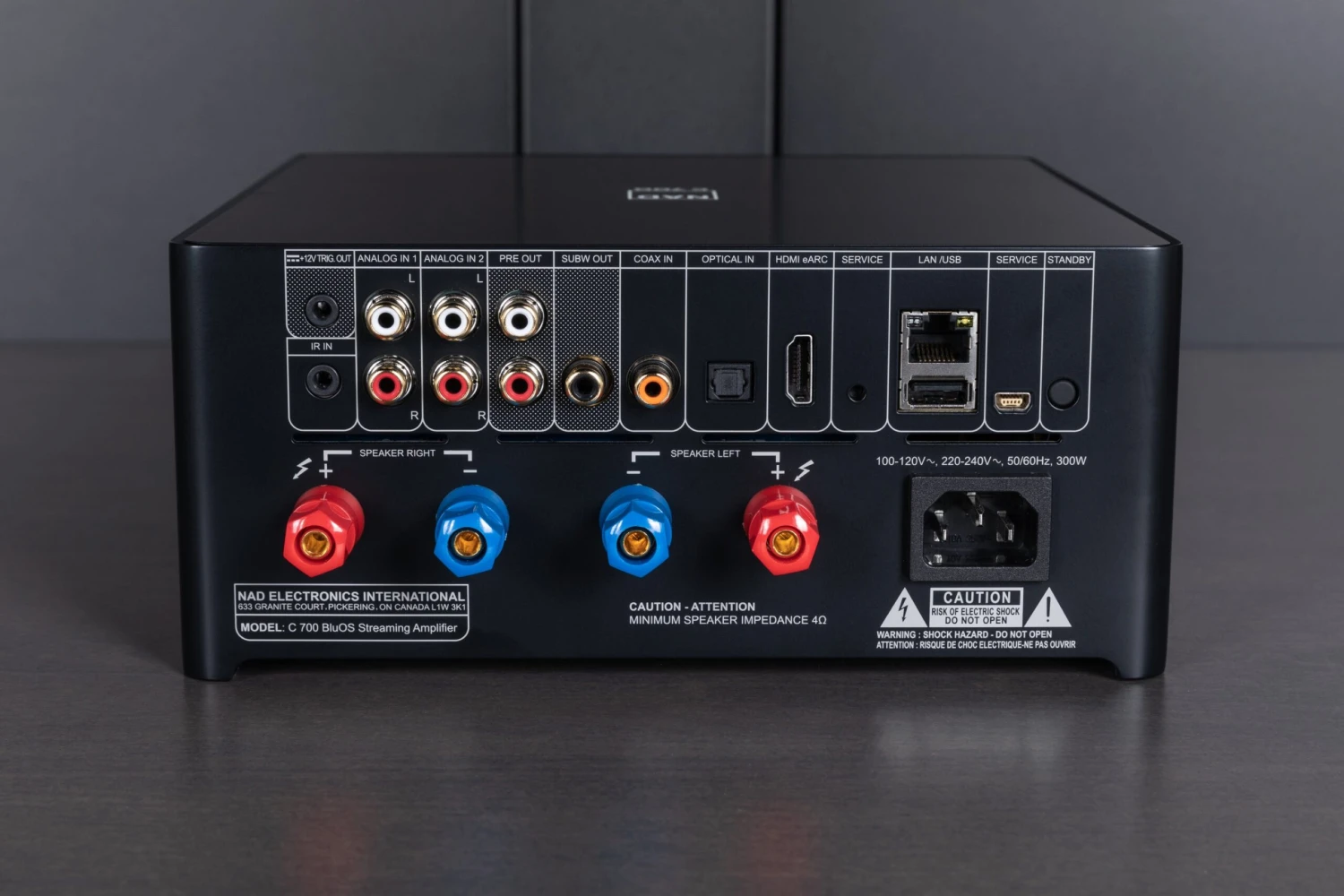 The NAD C700 is a BluOS streaming digital amplifier with an amazing, high-definition, non-touchscreen display. Its super sleek, compact aluminum chassis and glass front panel make it not only easy to tuck away but something you’ll catch yourself gazing at quite a bit. It’s pretty.