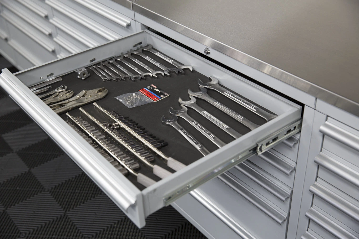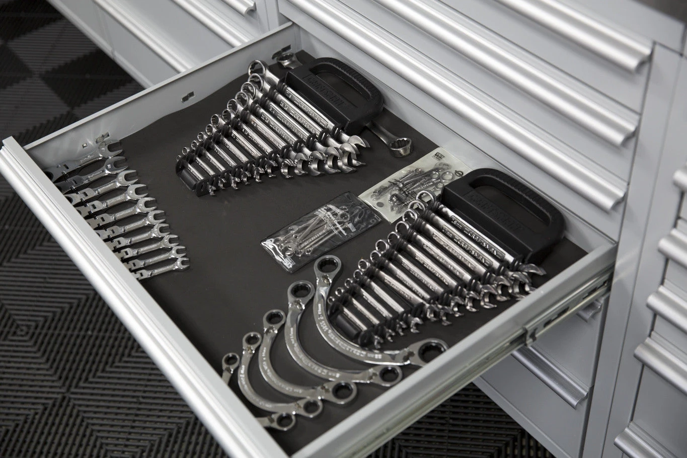 We also found when we installed these in the new garage that you can mix and match the drawers. The taller drawer is exactly twice the height of the shorter drawer. And the rails are at symmetrical heights. This allows you to put two short drawers anywhere there is a taller drawer, or a taller drawer in place of two shorter drawers. You can create 5, 7, and 8-drawer configurations this way.