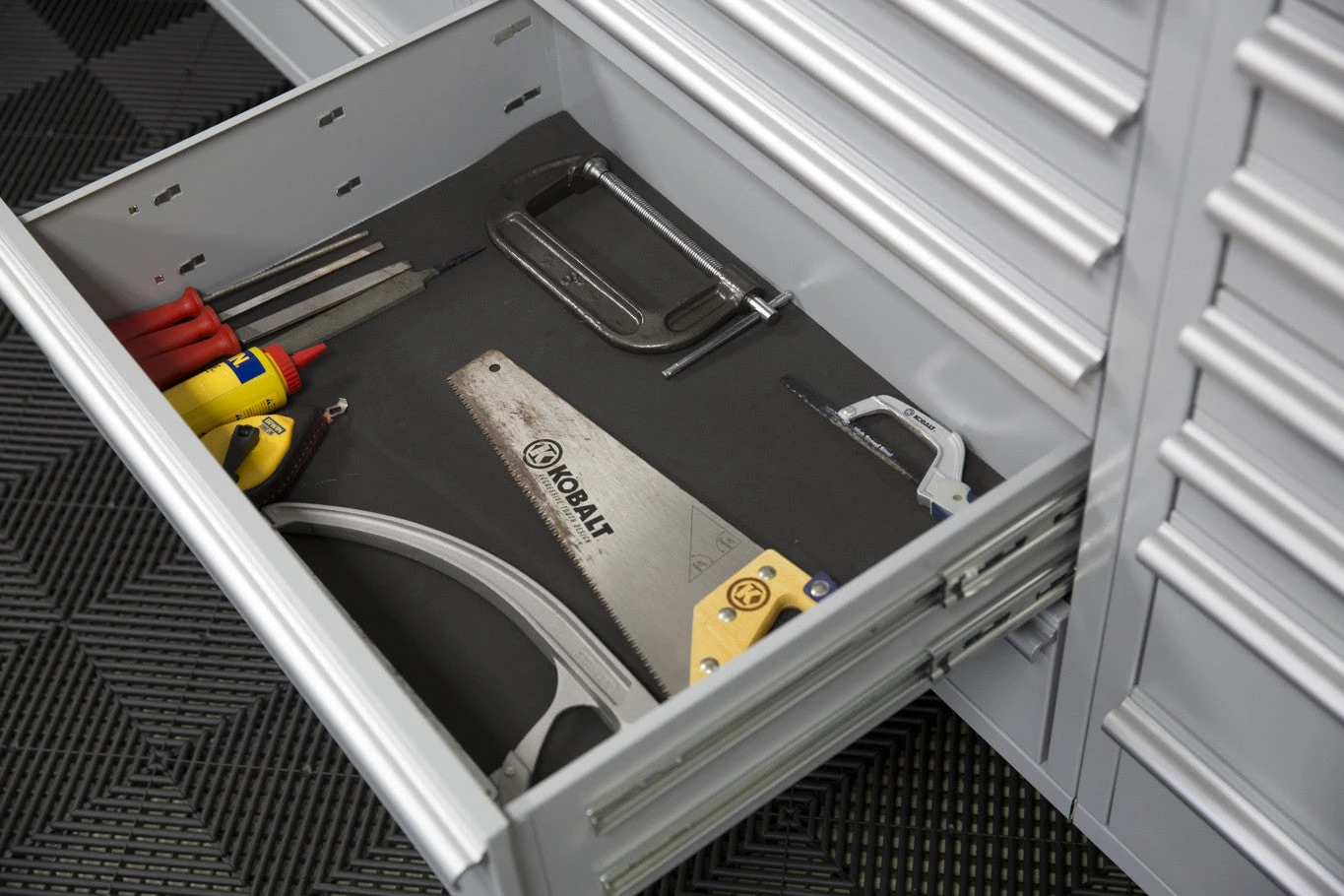 This is a pretty standard 6 drawer base cabinet, I use it in my current garage setup. You would choose this instead of the 4 drawer cabinet if you’re looking to store smaller items in the cabinet or use them together to create the base for the tabletop. These are great for tool storage.