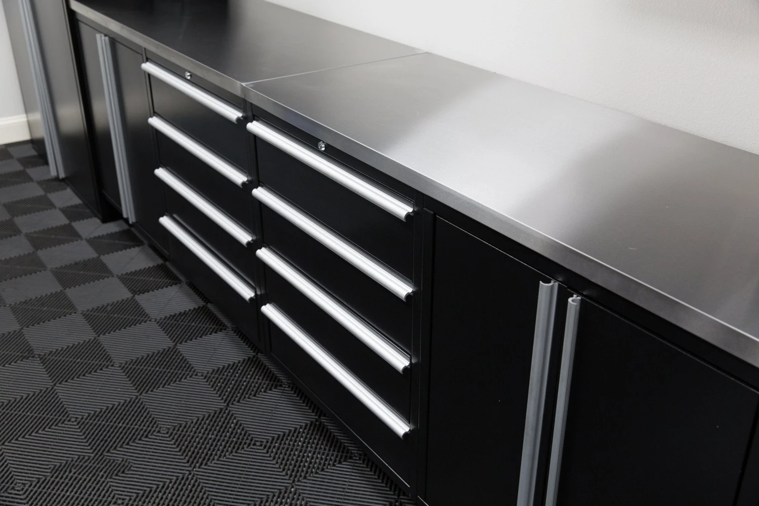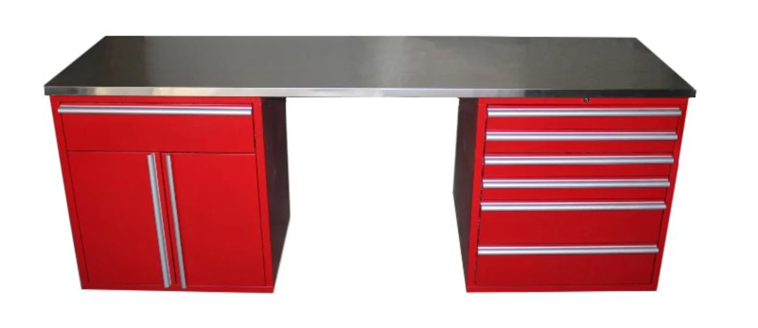 Work Tops are stain-resistant and designed for heavy-duty use. Tops are constructed of Stainless Steel wrapped around a laminate core. Corners are welded and the front edge is rolled underneath the worktop. Pre-drilled holes in the top of Base Cabinets allow easy mounting of the stainless top using 1″- 5/16″ Lag screws (not included). Vises and other tools can be mounted using carriage bolts.