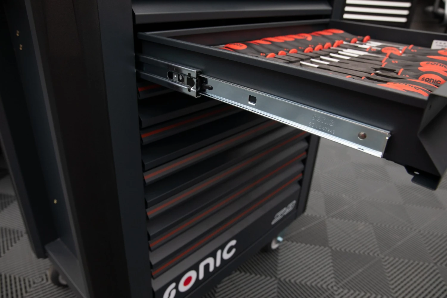 Sonic’s NEXT S12 XD is their advanced toolset. It’s noticeably different from other toolboxes (like the S12) because of its depth. This thing is 24.8” deep, giving you ample storage capacity for all your tools.