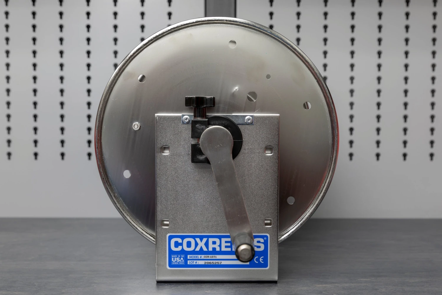 This reel is a US-made, no-frills, super high quality, compact reel that fits neatly under the 18″ stainless shelf I’ve sourced for my on-wall pressure washing solution. This is the smallest option. The others had more features, but they were too bulky or stuck too far off the wall. This one holds up to 100′ of 5/8″ outside diameter hose. It’s shown with the 100′ 5/8″ OD High-Pressure hose. It still works and looks good with a 50′ or 75′ hose on it.