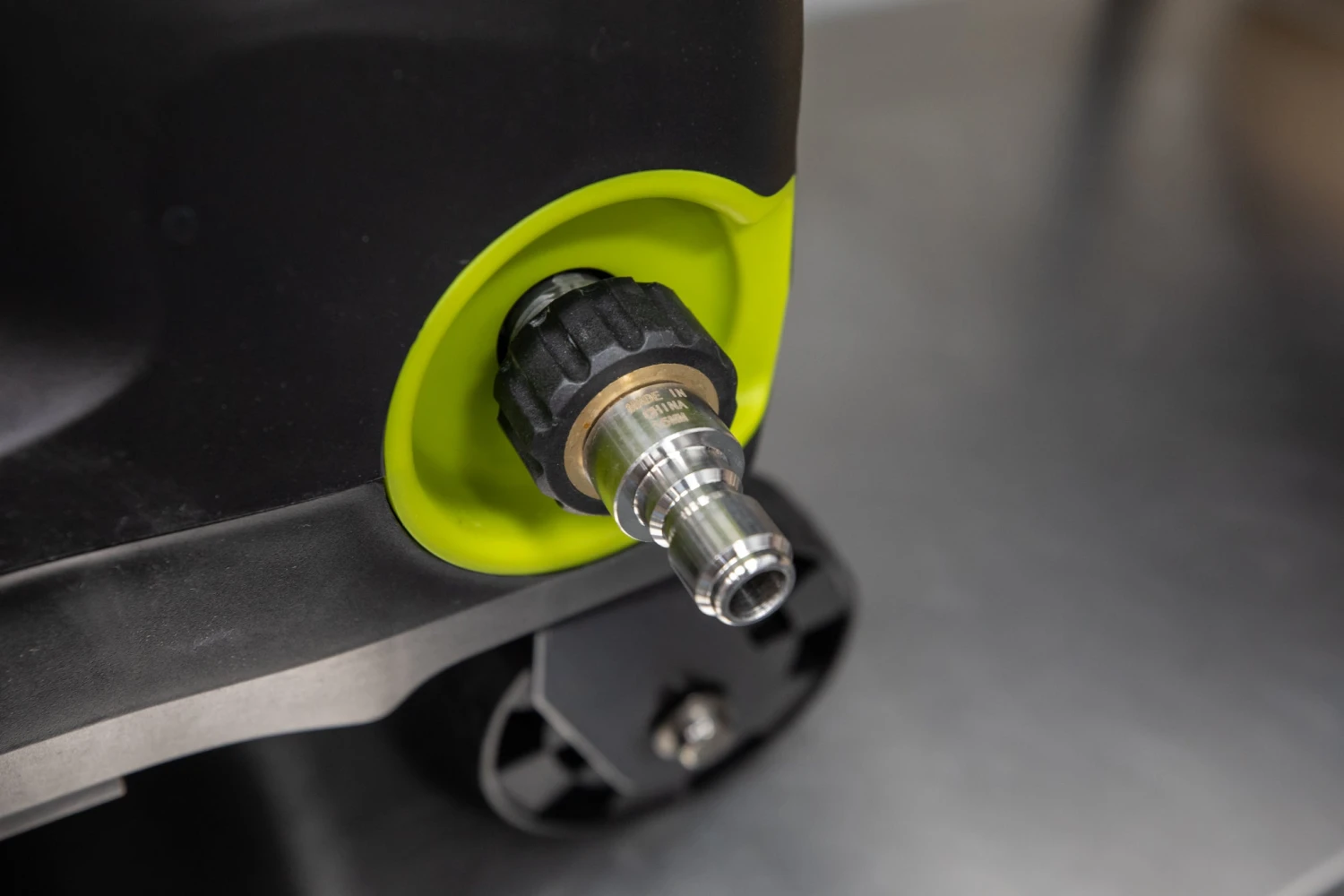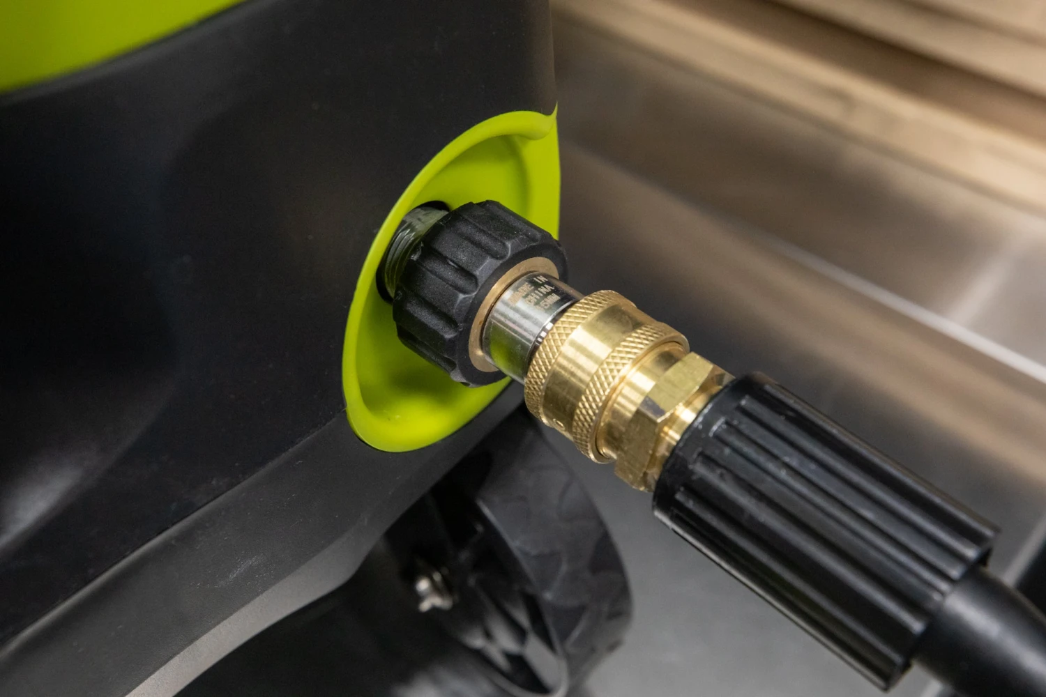 SunJoe, AR Blue Water Outlet -> M22 (15mm) Female to 3/8″ Plug -> 3/8″ Female Coupler -> High-Pressure Hose -> 3/8″ Female Coupler -> Our MTM or Mosmatic Sprayer Kit