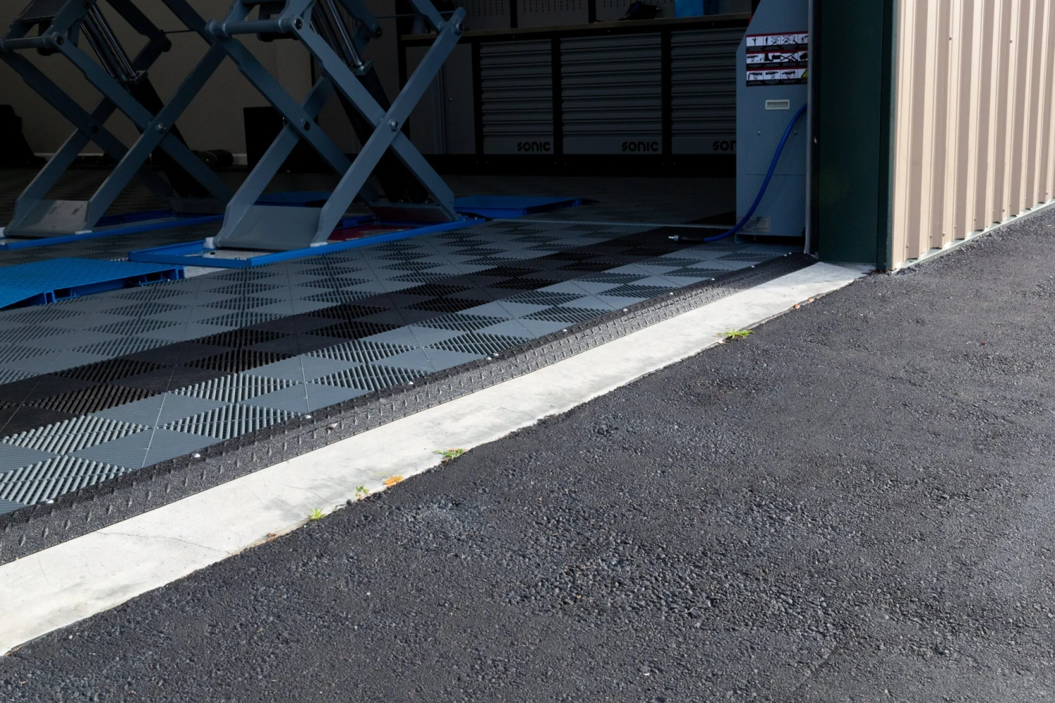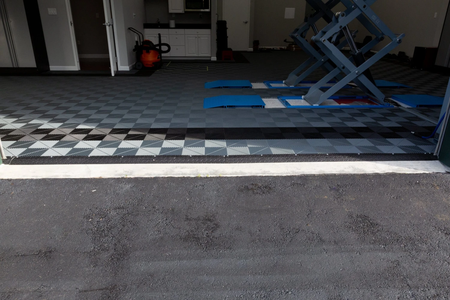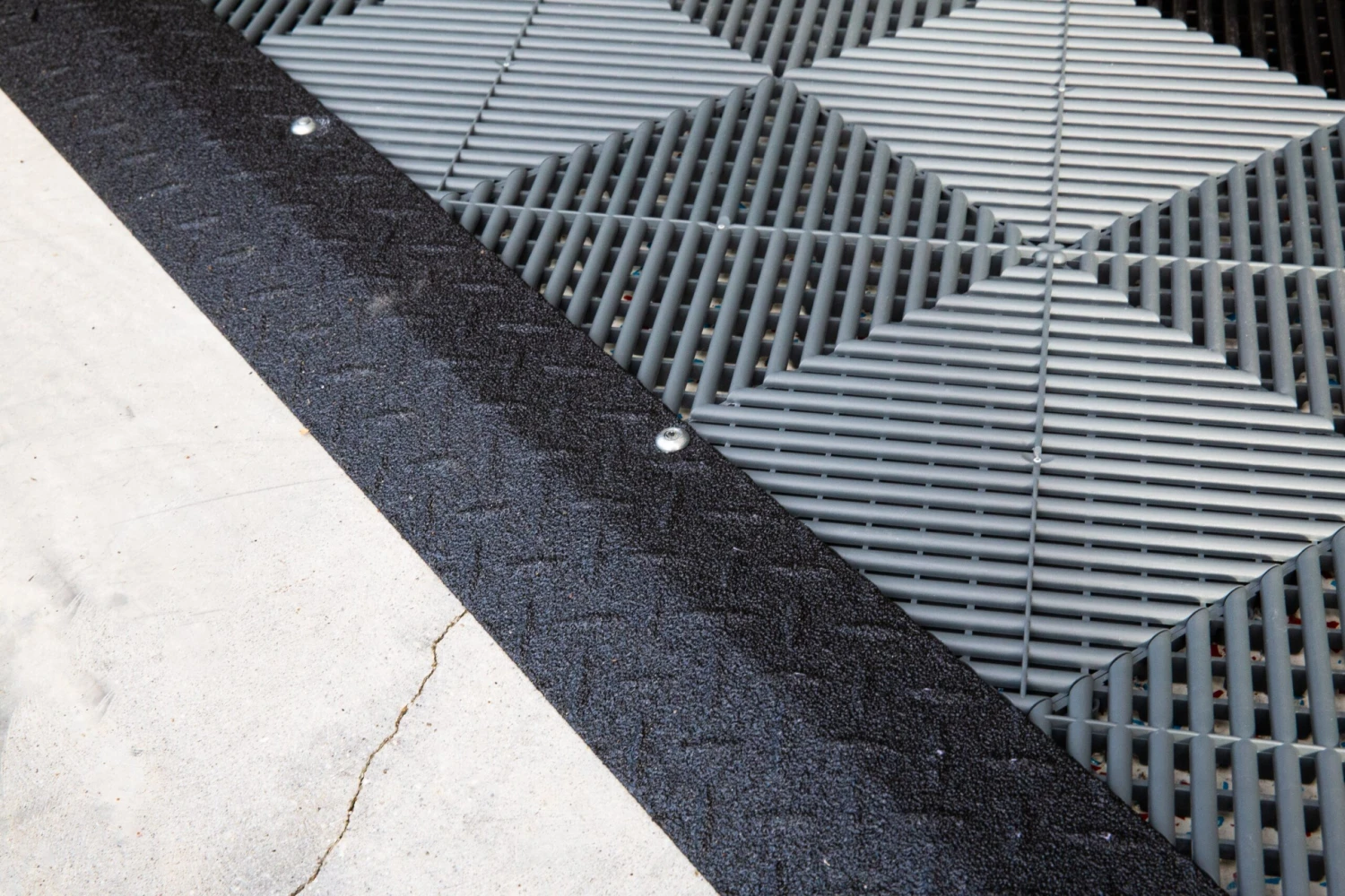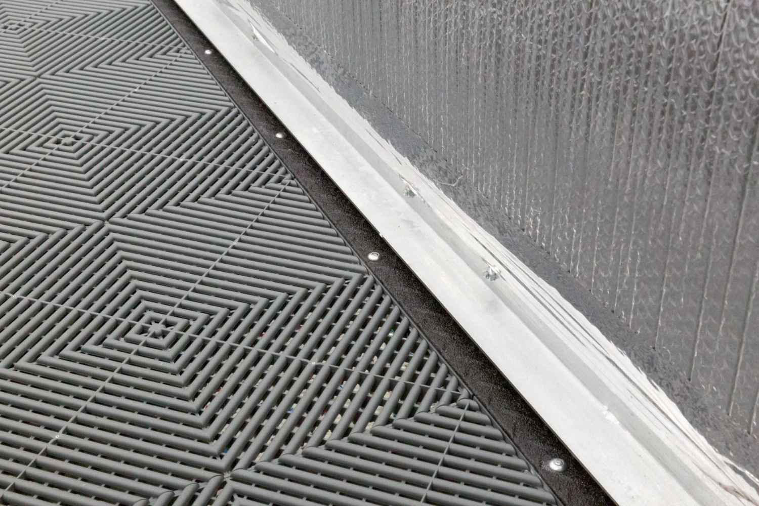 Ever since getting a forklift, I realized we needed something more robust than the Swisstrax edge pieces to stop them from coming undone and getting ruined constantly. This is where Treadware comes into play. This essentially mounts on top of the edge of your Swisstrax tiles (without edge pieces) and creates a smoother (and more robust) transition for you to drive over. It only comes in one size (6″ x 6″ x 70″) but it can be easily trimmed to any size with an angle grinder. I used expandable concrete anchors to anchor it into the concrete at OGHQ. We also sell a version that looks chrome, but I prefer the textured black version for a cleaner and more modern look.