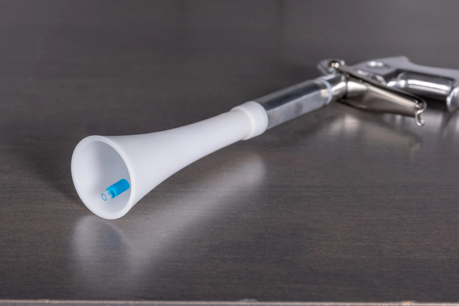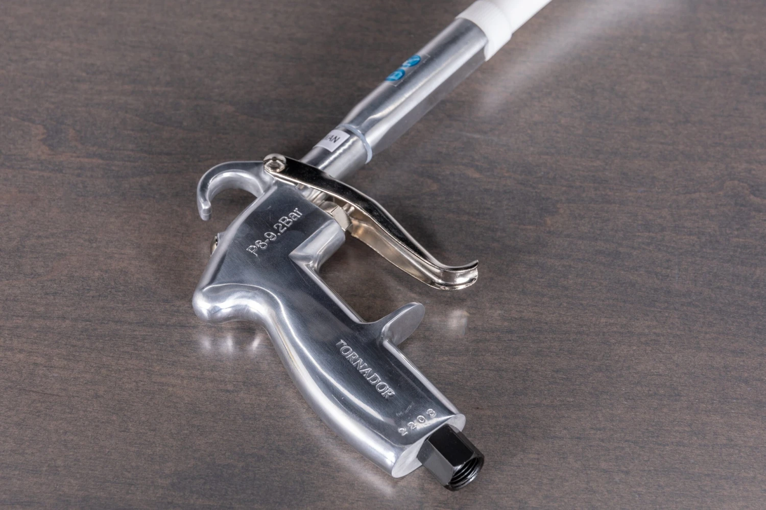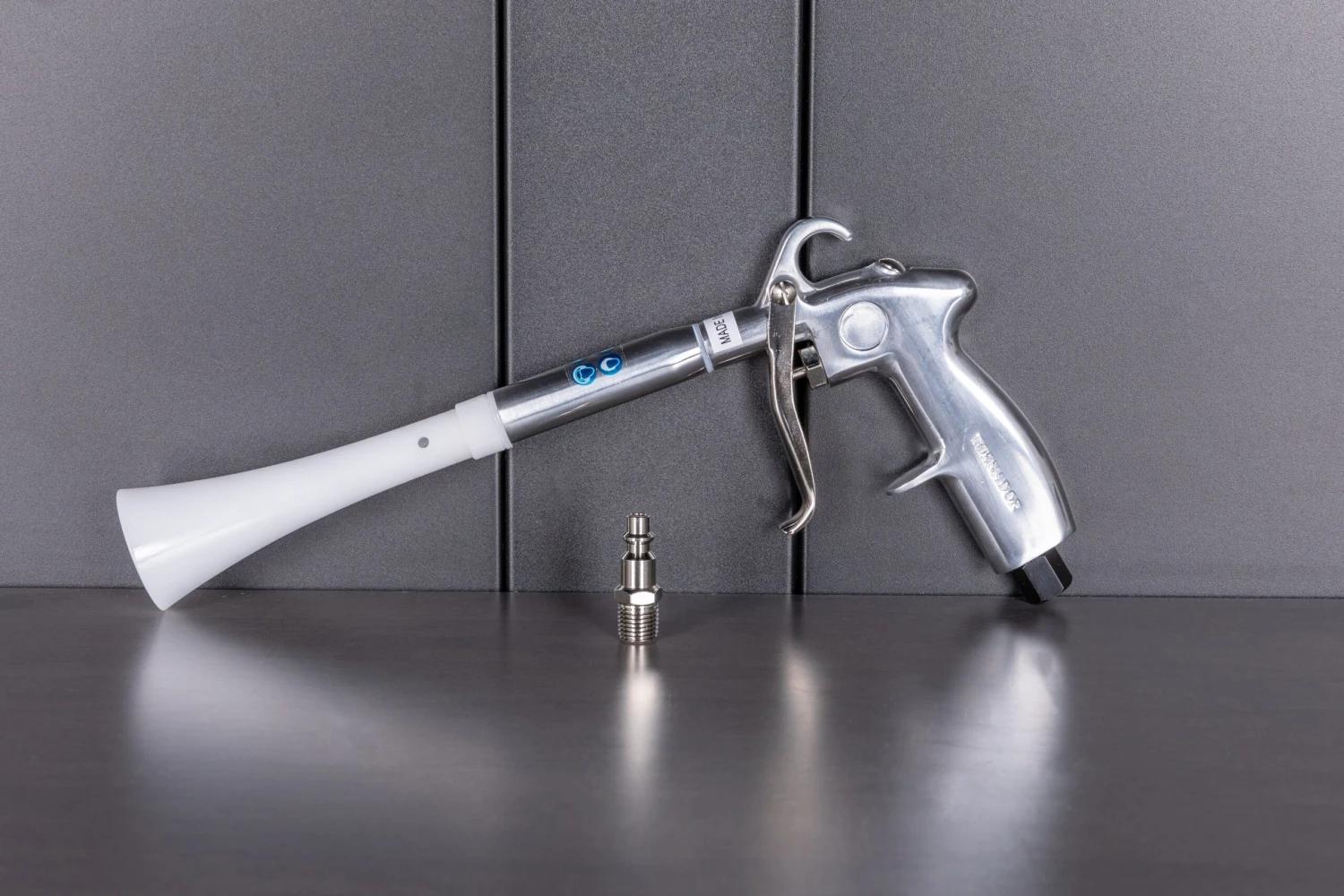 operating between 60 and 90 psi. There’s a tube with a weight on it within the cone that spins really fast. The cone channels air into a powerful tornado-like motion that quickly lifts dirt and moisture from any surface, blowing things out more efficiently and effectively.